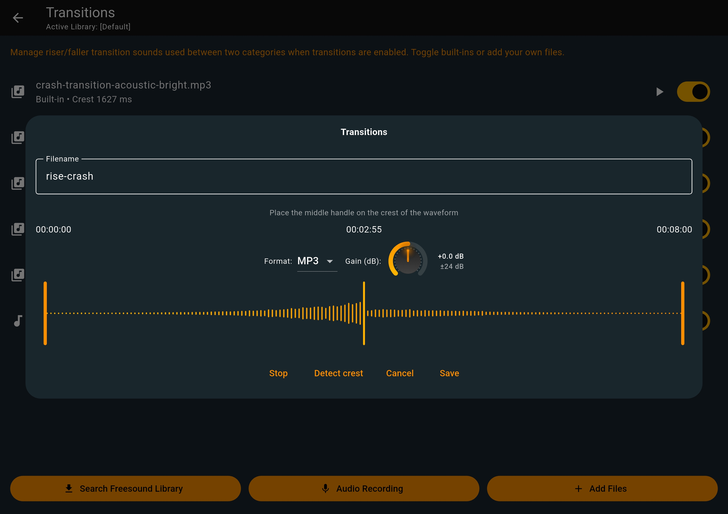 To time transitions precisely, Audio Forge automatically detects the waveform crest of the file and aligns the category switch to that peak. Example: if a transition file is 8 seconds long and the crest is at 4 seconds, the actual category switch happens ~4 seconds after you tap the new category, right on the impact.