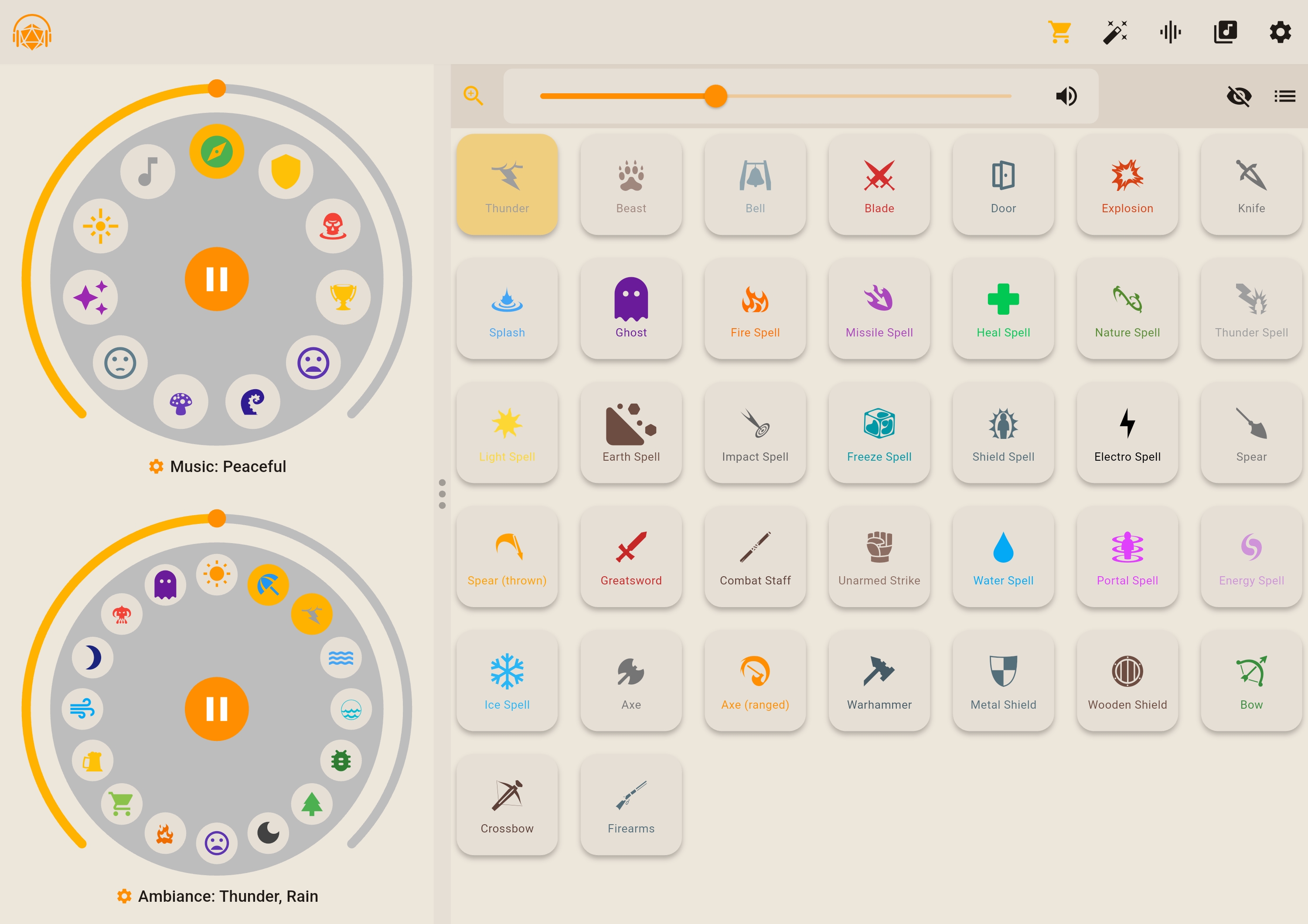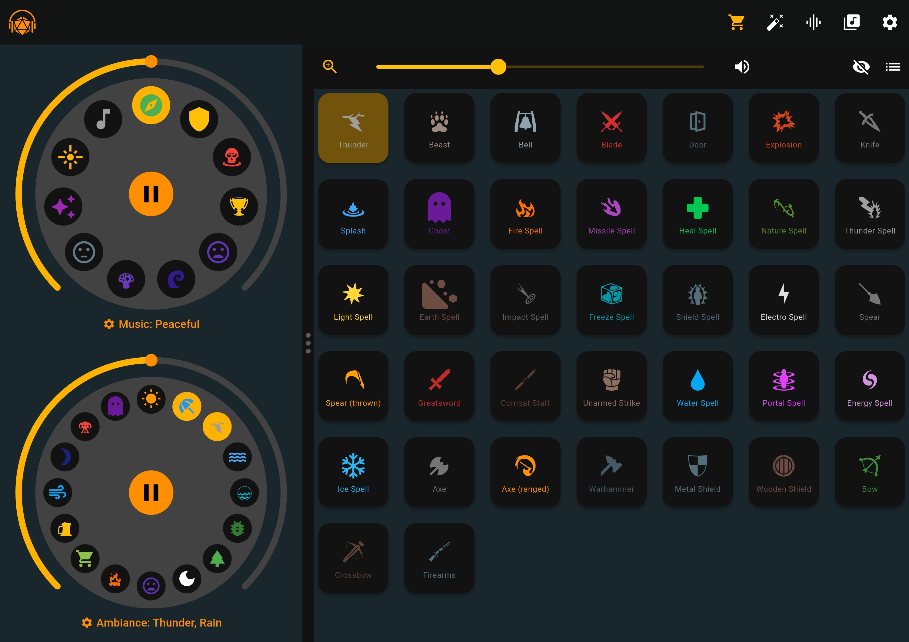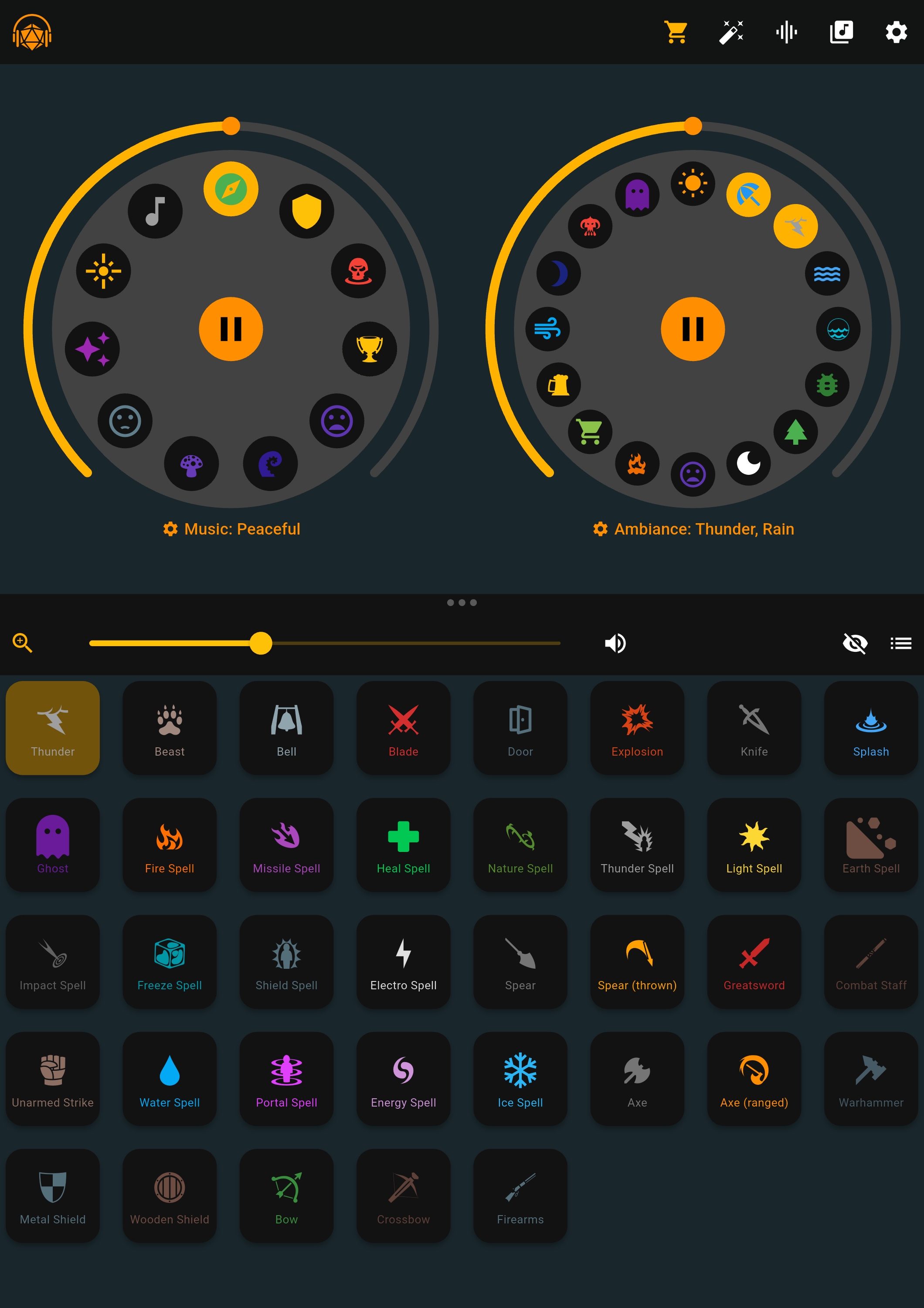 The previous layout showed the Anvil wheels (Music & Ambiance) and required using bottom navigation to reach Echoes (one‑shot sounds). On bigger screens, like iPads, external displays, tablets and desktop, Unified View places both in a split view with a draggable handle so you can keep everything visible at once.