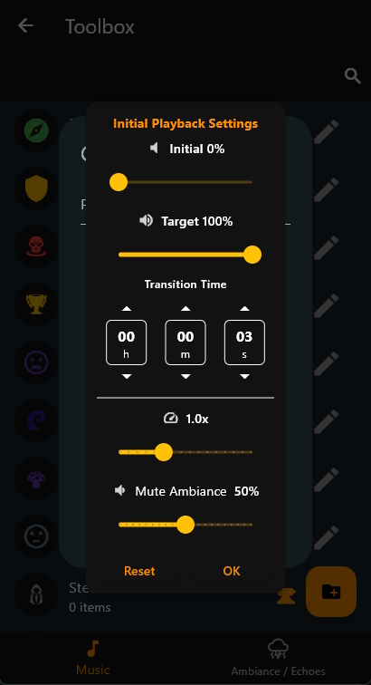 In 1.4.9, every Music category can specify a ducking percentage (0–100%). When that music plays, all ambiance categories reduce to that percentage of their current volume. When the music stops, ambiance smoothly returns to full volume. No manual adjustments, no interrupting your flow to tweak sliders.
