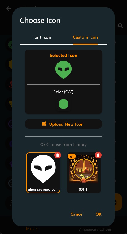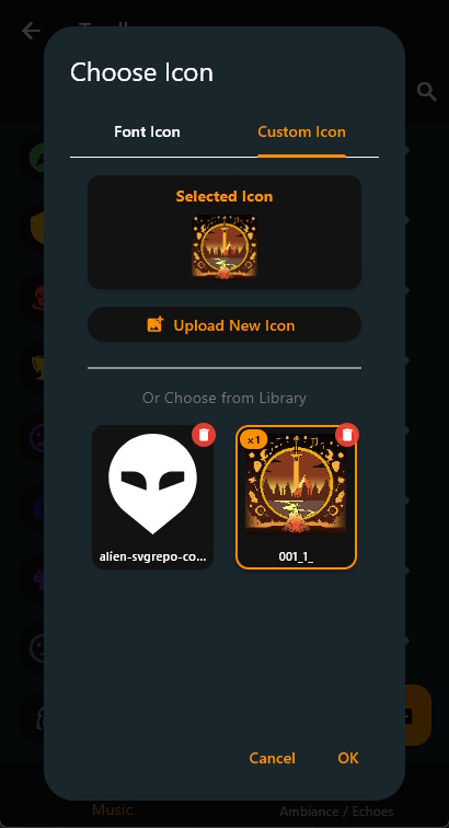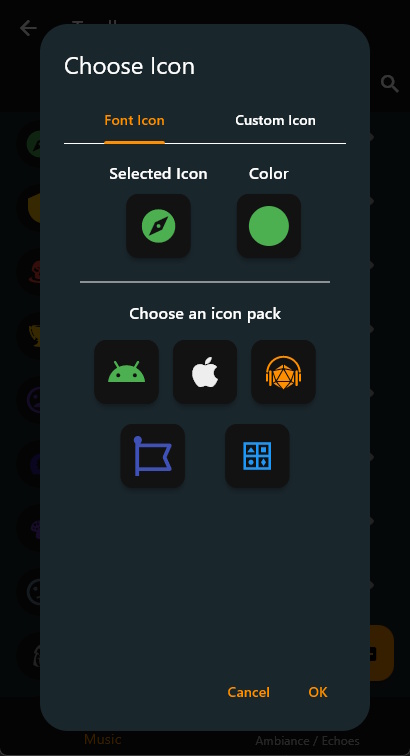 Until now, categories used font icons from Material Icons, Font Awesome, Cupertino, and Line Awesome. That’s hundreds of options, but sometimes you want that exact dragon illustration or your campaign’s heraldic crest.